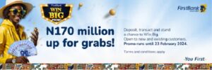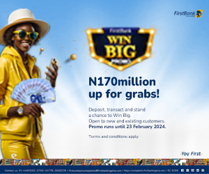 FirstBank, Nigerias premier financial institution and leading financial inclusion services provider, has launched the Win Big promo to reward and delight its valued customers. The four-month promo, which started on 23 October 2023 and will run till 23 February 2023 will reward several new and existing customers of the Bank with a total cash reward of 170,000,000.00 naira.