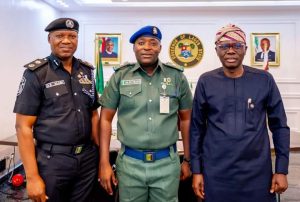 L-R: Commissioner of Police, Lagos State Command, CP Sylvester Abiodun Alabi; Aide-De-Camp to Gov. Babajide Sanwo-Olu, SP Silas Tsado and Governor, Lagos State, Mr. Babajide Olusola Sanwo-Olu at the State House.